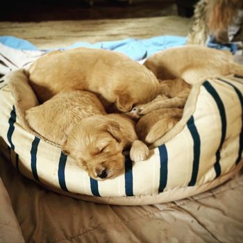 Our dogs are family pets that sleep in our beds, sit on the couch and go everywhere with us. Whelping is a family affair. Kim and Jim help each puppy enter the world. Our Dam's are well cared for from conception through the last puppy going home, with routine vet visits, specialized diet, grooming and individualized attention. Our boys assist with the puppies the entire time they are in our homes, with keeping each puppy clean, healthy and well socialized.